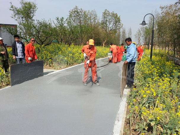 4、 將拌和好的混合料均勻倒在路面上,采用刮涂設(shè)備或噴灑設(shè)備將漿液均勻的施工在道路表面。